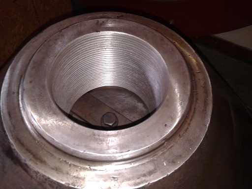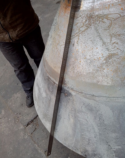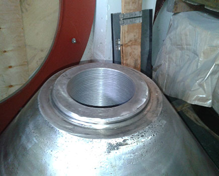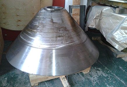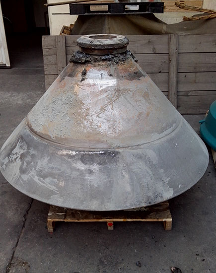 2014-06-10 客戶HP500 破碎機動錐體在更換襯板時發現鎖緊螺栓不能拆卸,運到我公司維修。由我司技術人員判定為動錐體內螺紋損壞,同時檢查動錐體外錐面,發現磨損嚴重。