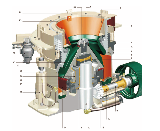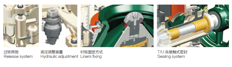 LCH 系列圓錐破碎機只需更換定錐襯板、動錐襯板、適配環和楔塊螺栓,即可將破碎腔型在短頭超細到標準超粗之間任意轉換。